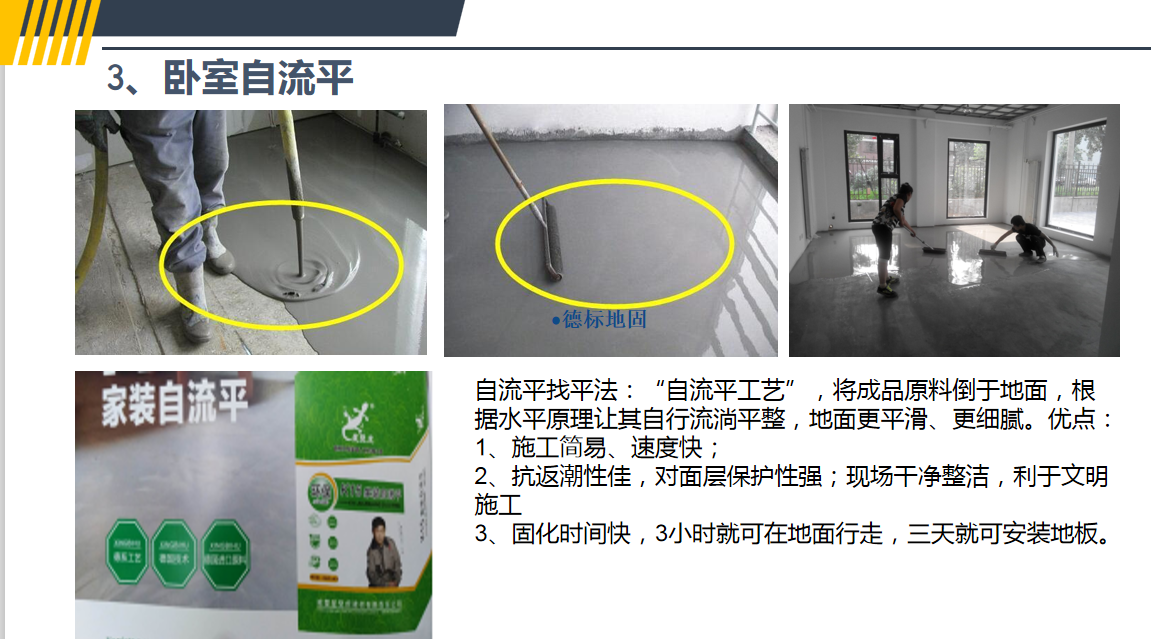 自流平找平法:“自流平工藝”,將成品原料倒于地面,根據水平原理讓其自行流淌平整,地面更平滑、更細膩。優點: