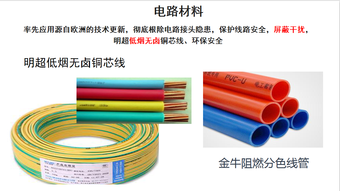 率先應用源自歐洲的技術更新,徹底根除電路接頭隱患,保護線路安全,屏蔽干擾,明超低煙無鹵銅芯線、環保安全